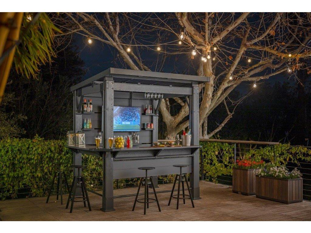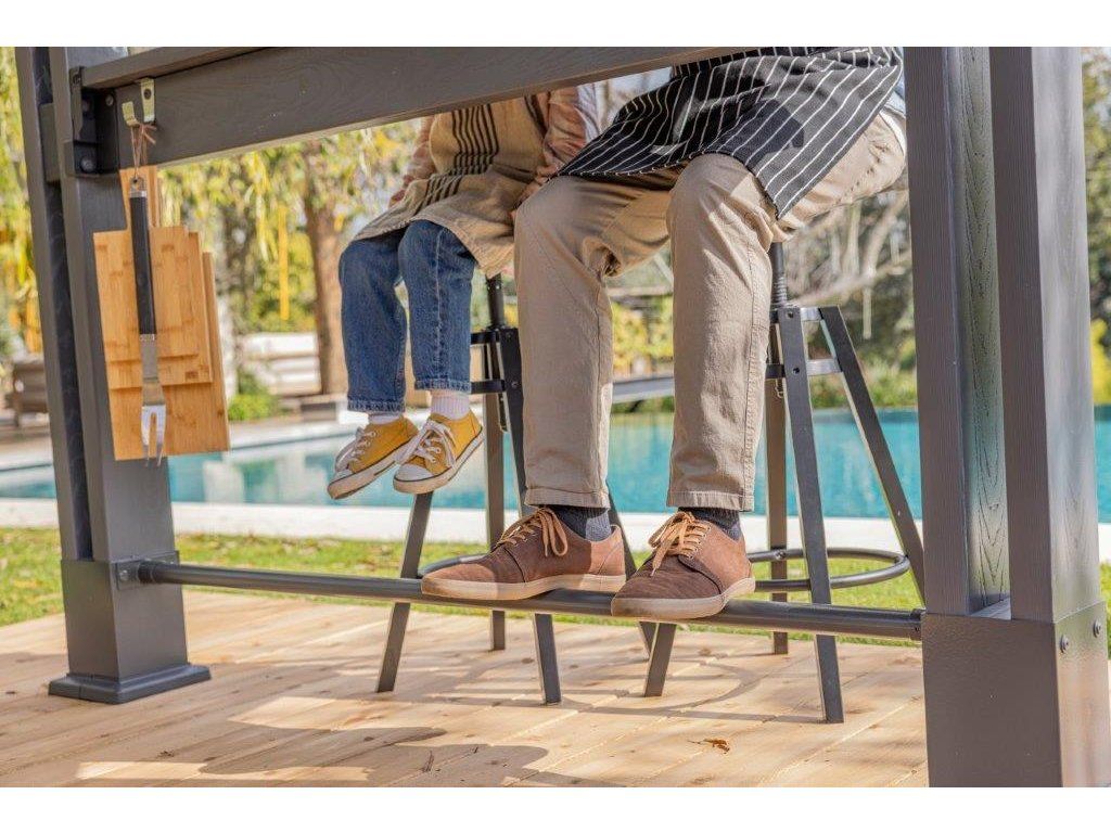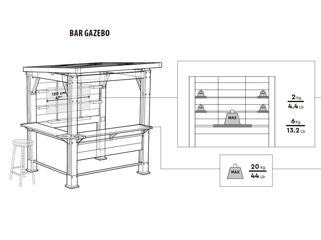 Altán Keter Bar Gazebo využijete jako venkovní bar pro servírování nápojů i občerstvení. Součástí konstrukce je barový pult ve výšce 105 cm, který poskytuje dostatek prostoru pro přípravu i podávání. K dispozici máte celkem 5 polic, z toho čtyři menší s nosností 2 kg a jednu větší s nosností 6 kg. Samotný barový pult unese až 20 kg, takže na něj bez obav odložíte nápoje, sklenice i další vybavení. Praktické držáky na sklenice udrží vše přehledně uspořádané a konstrukce umožňuje také umístění televize pro ještě lepší atmosféru při sledování sportovních přenosů nebo oblíbených pořadů.