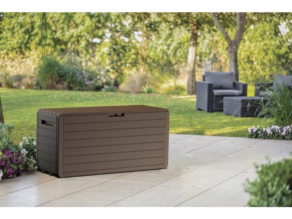 Hnědá barva s texturou imitace dřeva dodává boxu elegantní vzhled, který se hodí na terasu i do zahradního altánu. Díky odolnému materiálu a kvalitnímu zpracování si box zachová svůj vzhled i po letech používání.