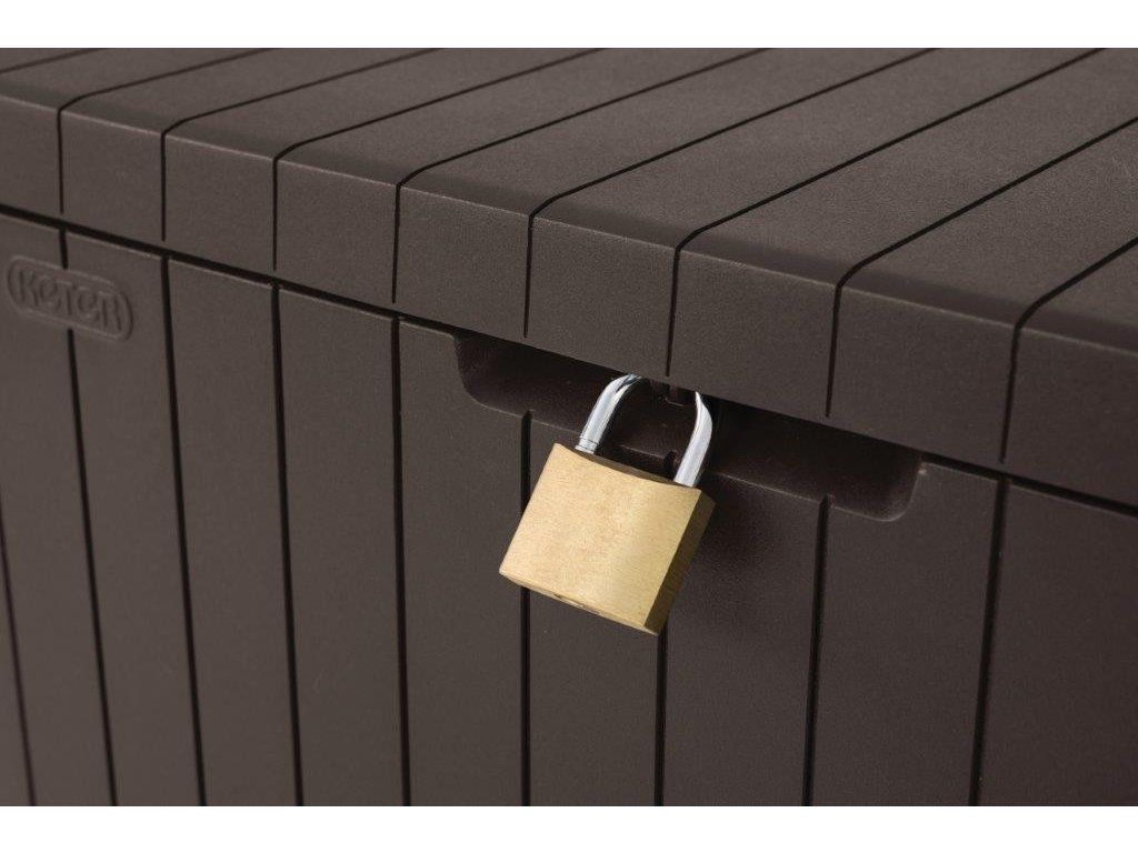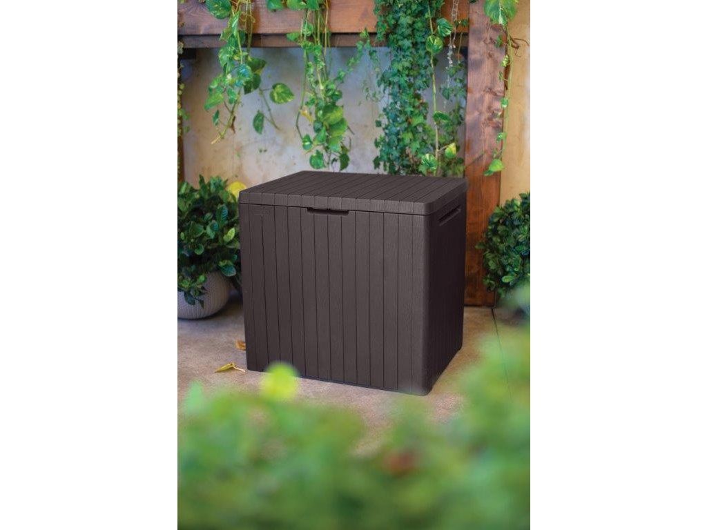 Úložný zahradní box City Storage značky Keter v hnědé barvě má kapacitu 113 litrů. Svým designem připomíná přírodní dřevěné palubky. Skvěle tak doplní jak moderní, tak i tradiční look okolí. Velkou výhodou boxu je jeho nízká hmotnost a voděodolnost.