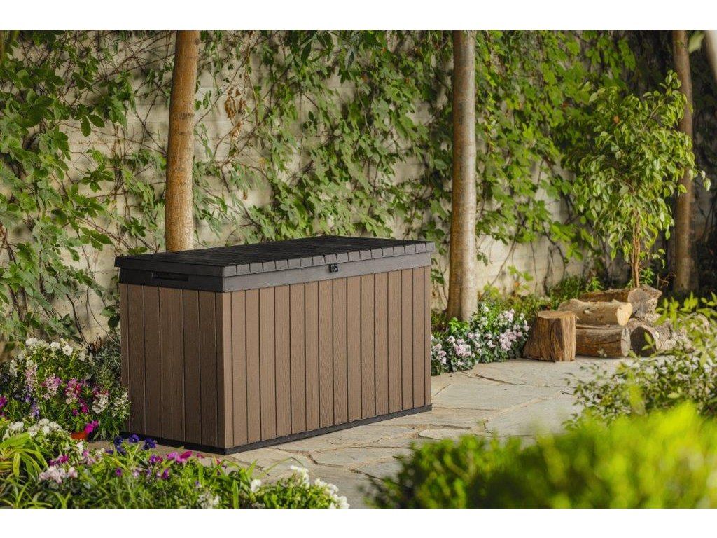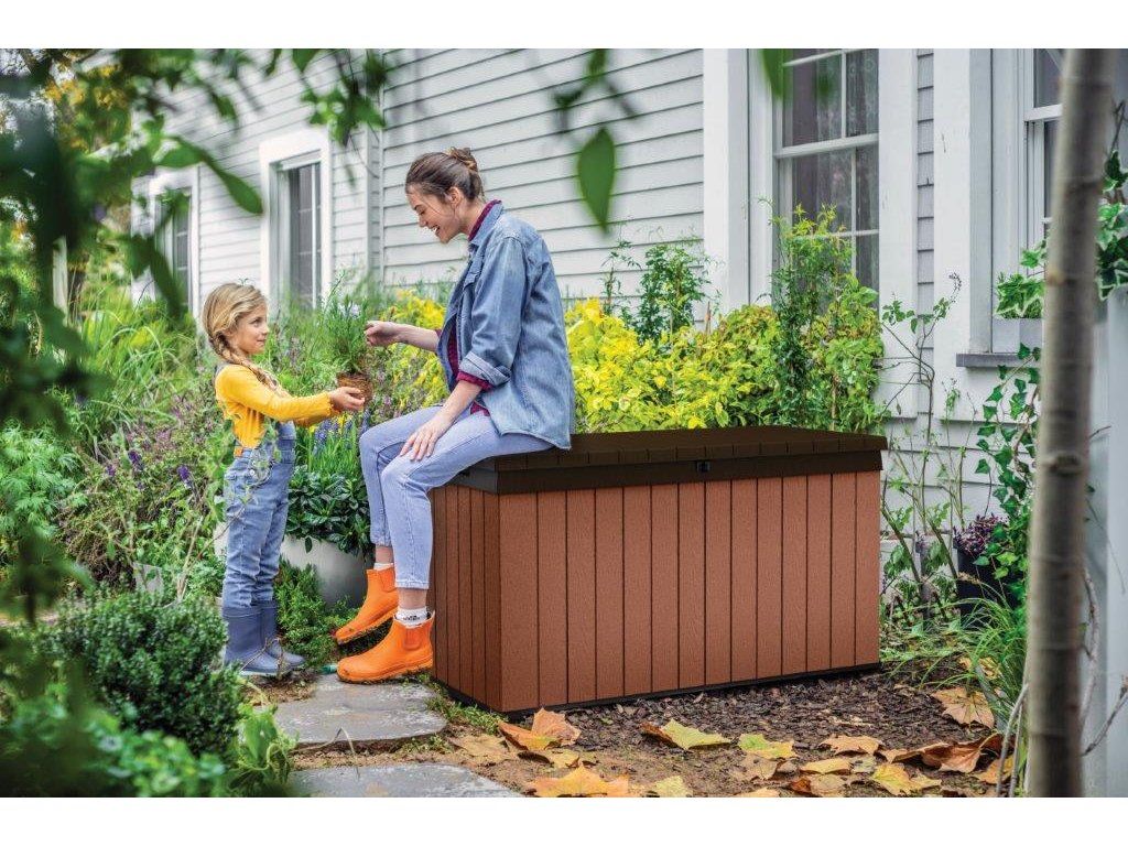 Najděte pro box ideální místo na zahradě. Díky struktuře, která připomíná dřevo, zapadne do každého prostředí. Uložené věci navíc můžete uzamknout uvnitř boxu. Hydraulický pístový systém zajistí plynulé a bezpečné zavírání a otevírání víka. Po zavření se na něj navíc usadí až 2 lidi.