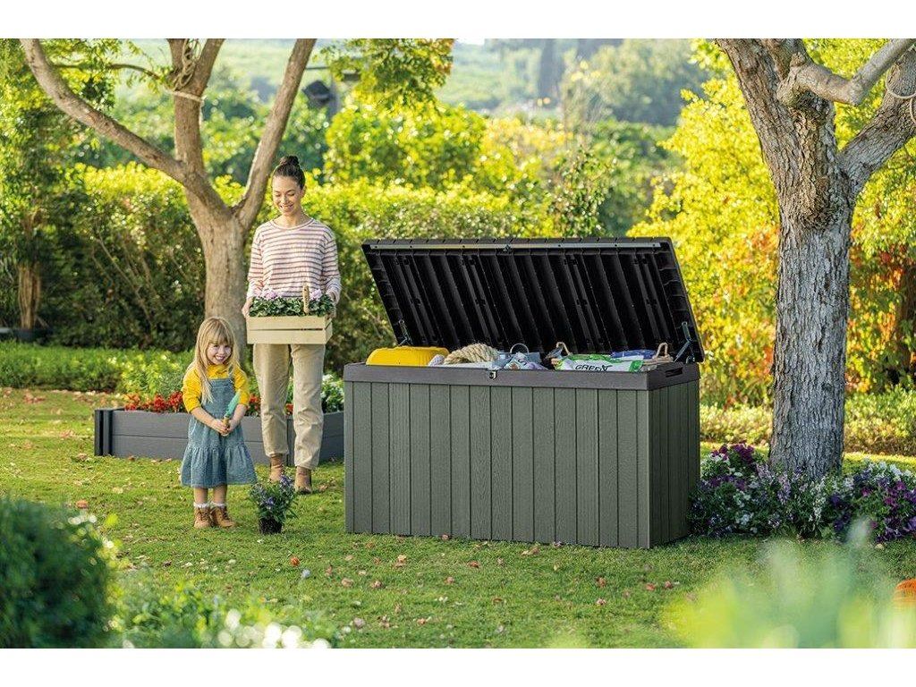 Najděte pro box ideální místo na zahradě. Díky struktuře, která připomíná dřevo, zapadne do každého prostředí. Uložené věci navíc můžete uzamknout uvnitř boxu. Hydraulický pístový systém zajistí plynulé a bezpečné zavírání a otevírání víka. Po zavření se na něj navíc usadí až 2 lidi.