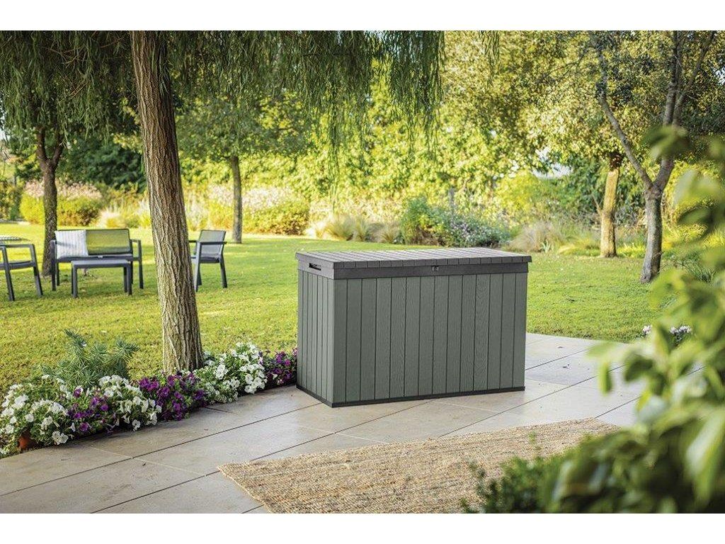 Najděte pro box ideální místo na zahradě. Díky struktuře, která připomíná dřevo, zapadne do každého prostředí. Uložené věci navíc můžete uzamknout uvnitř boxu. Hydraulický pístový systém zajistí plynulé a bezpečné zavírání a otevírání víka. Po zavření se na něj navíc usadí až 2 lidi.
