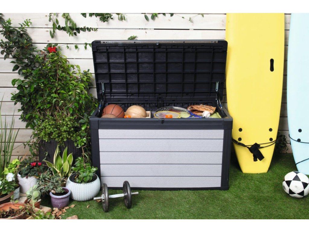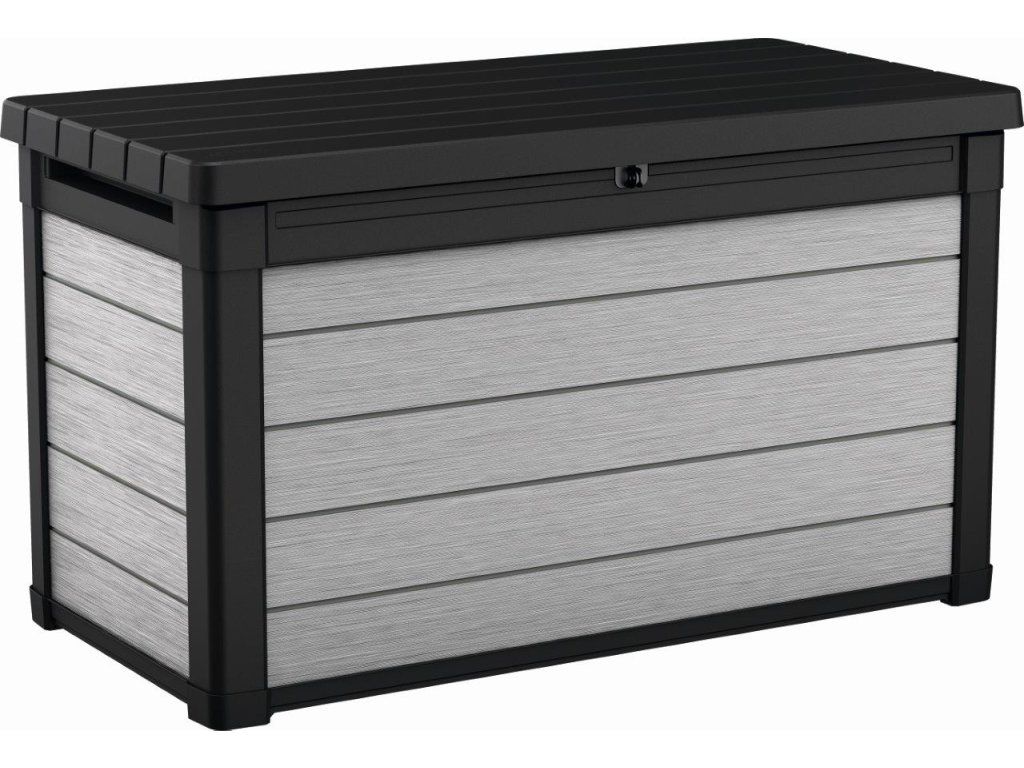 - Rozměrný nízkoúdržbový úložný box v designu šedého dřeva