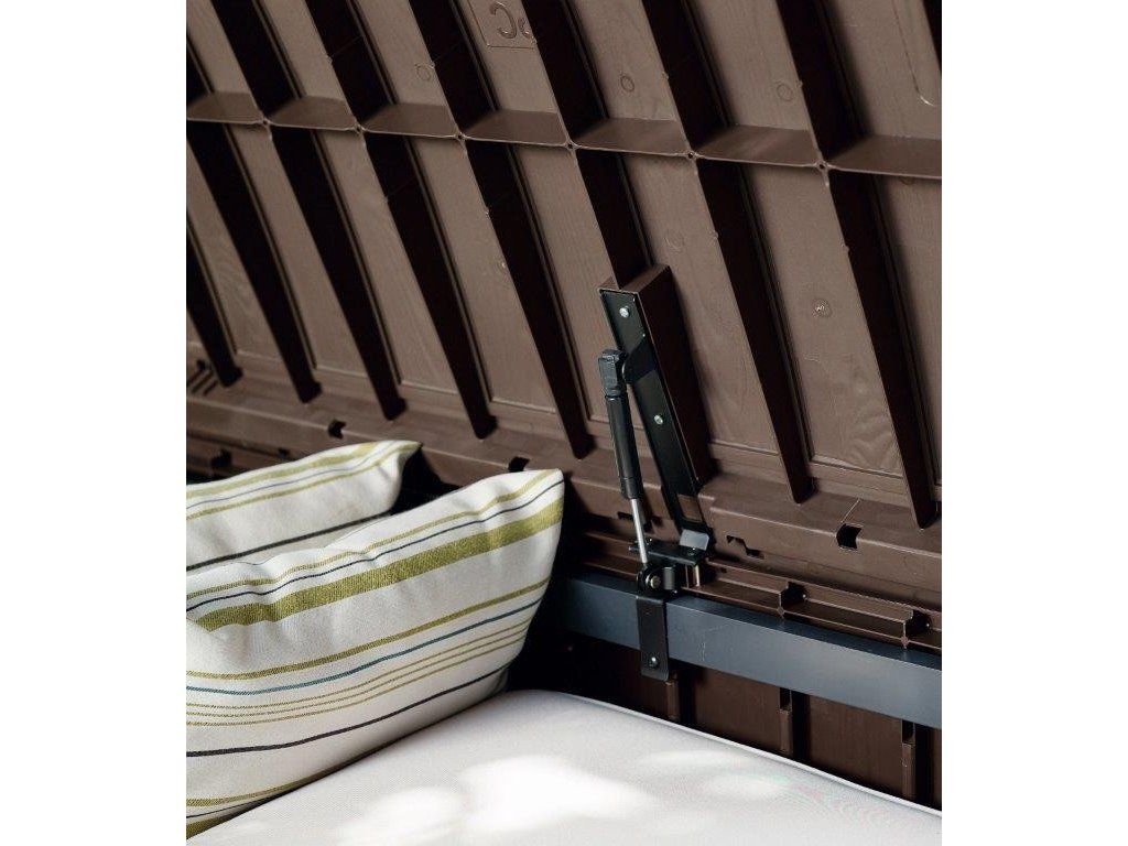 Zahradní box je vyrobený z vysoce kvalitní polypropylenové pryskyřice v moderním designu v hnědé barvě, který imituje dřevo a jeho strukturu. Skříň je nízká a její propracovaná konstrukce zvládne unést až 180 kg, takže ji mohou využít k sezení až 2 dospělé osoby. Stěny jsou vyztužené žebrovými segmenty, takže skříň hravě odolá i drsnému zacházení a vandalismu a nevadí ji ani extrémní počasí či UV záření.