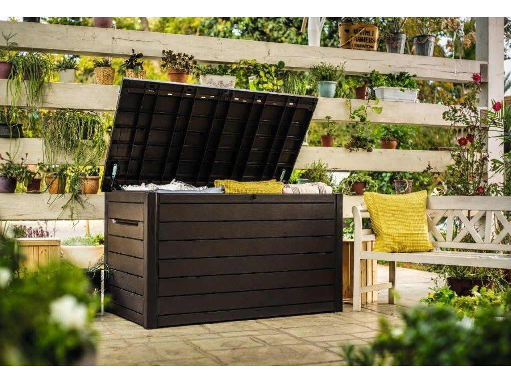 Zahradní box Ontario značky Keter v hnědé barvě má objem 870 litrů. S přehledem tak do něj uložíte deky, polštáře a osvětlení nebo třeba zahradní náčiní. A navíc ho můžete využívat jako stolek na občerstvení (nosnost 50 kg).