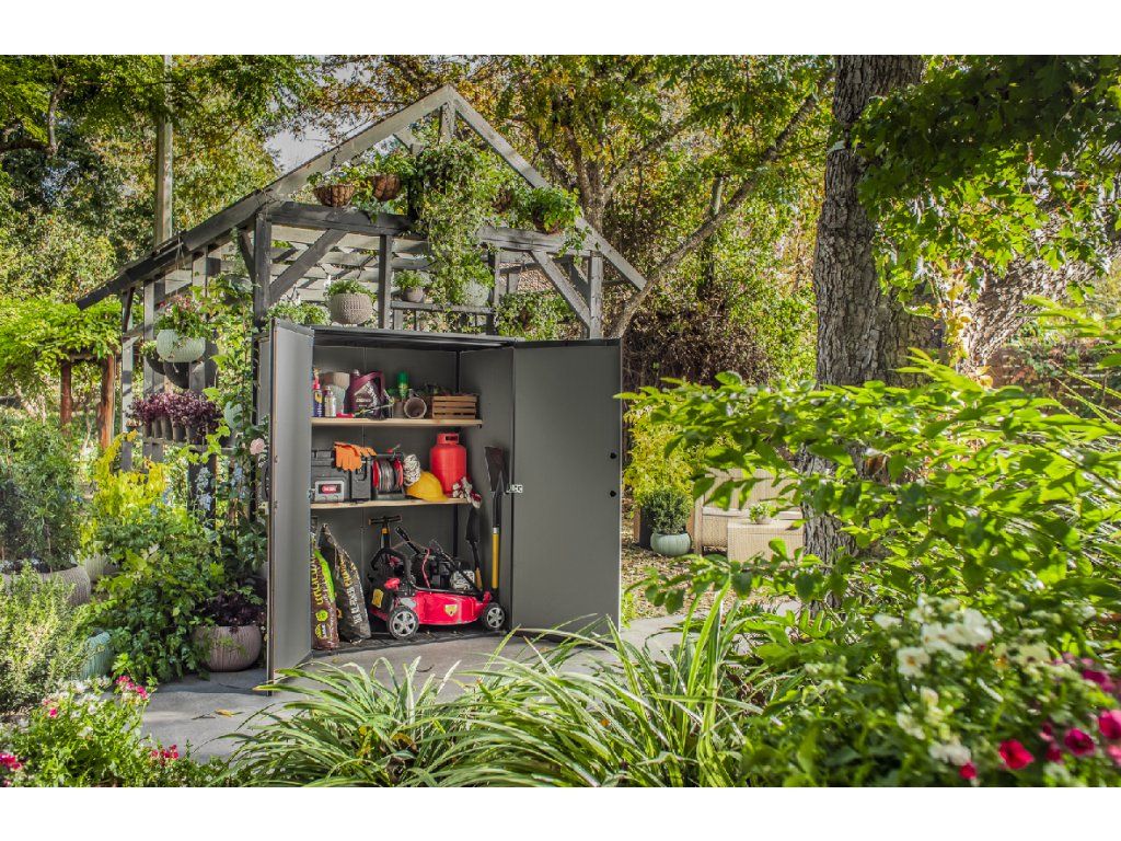- Prostorná 1500l skříň Keter Premier High Store slouží pro bezpečné uskladnění menších i větších kusů zahradního náčiní či grilu