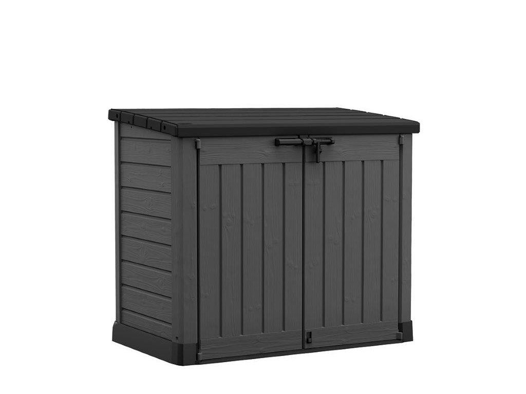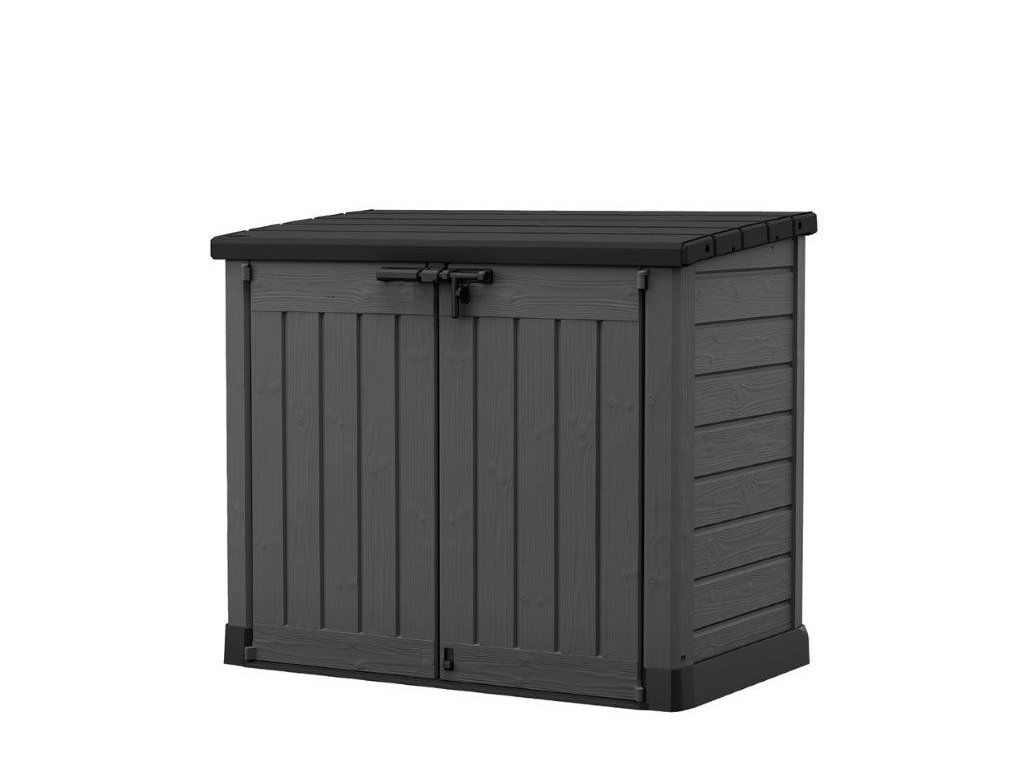 - Tmavě šedý přístřešek nabízí kapacitu 1200 l pro uložení popelnic, bazénové technologie a vybavení či zahradního nářadí