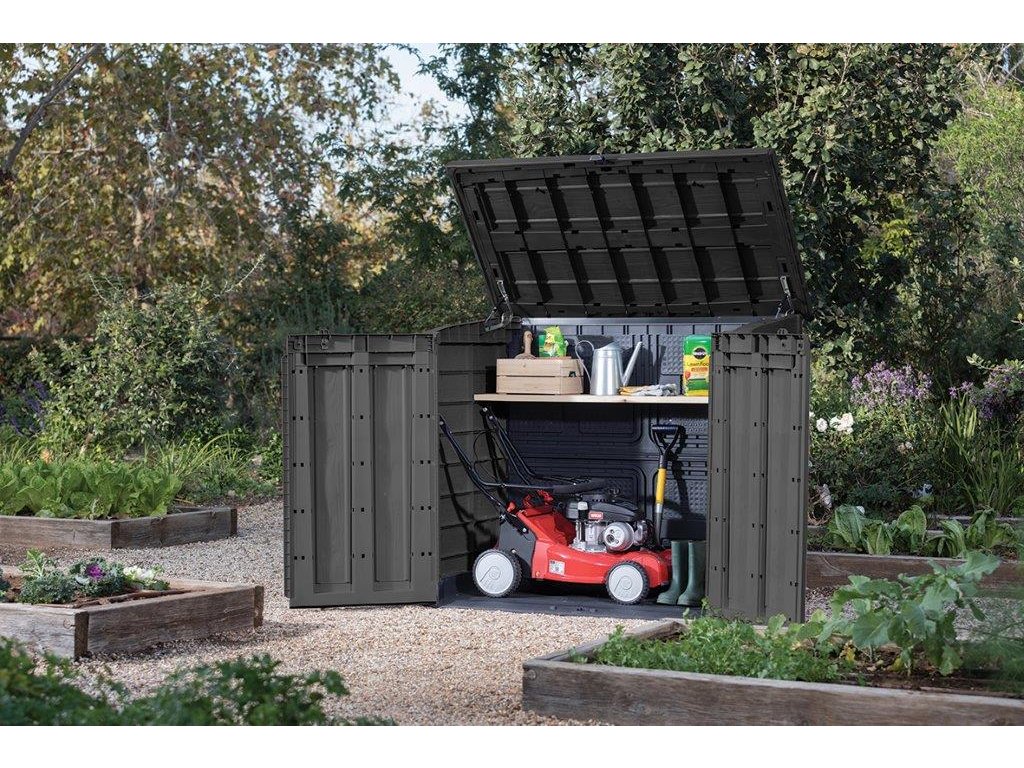 Potřebujete bezpečně uskladnit popelnice, nářadí nebo bazénovou techniku? Uzamykatelný přístřešek Keter Store-It-Out Max nabízí kapacitu 1200 l a odolnou konstrukci, která si poradí i s extrémním počasím, UV zářením i vandalismem. Díky chytrému systému otevírání a možnosti přidání polic se stane praktickým pomocníkem každé domácnosti.