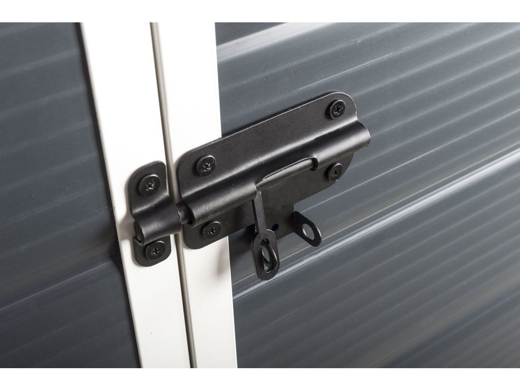 Nad dvoukřídlými dveřmi je umístěna ventilační mřížka, která zajišťuje dostatečné odvětrávání a cirkulaci vzduchu uvnitř domku. Proto se nemusíte bát plísní nebo srážení vody na stěnách v případě náhlých změn teploty.