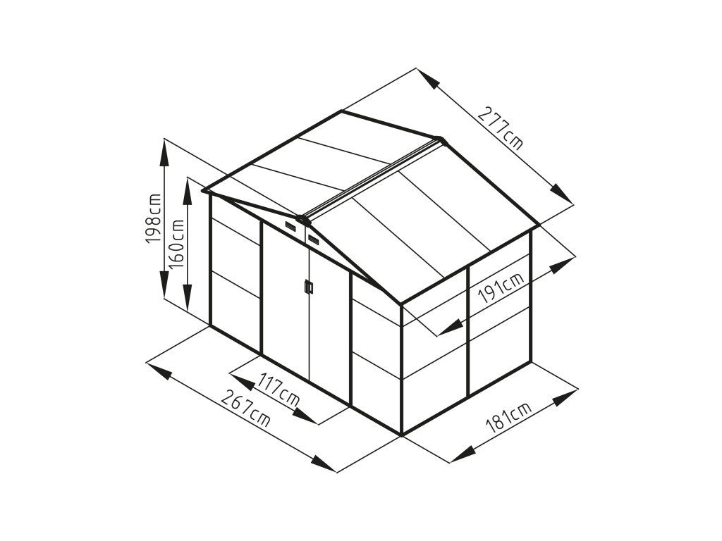 Šířka přední strany činí 277 cm, výška v nejvyšším bodě je 198 cm a šířka boční strany je 191 cm. Výška boční stěny bez střechy je 163 cm. Na přední straně se nachází dveře.