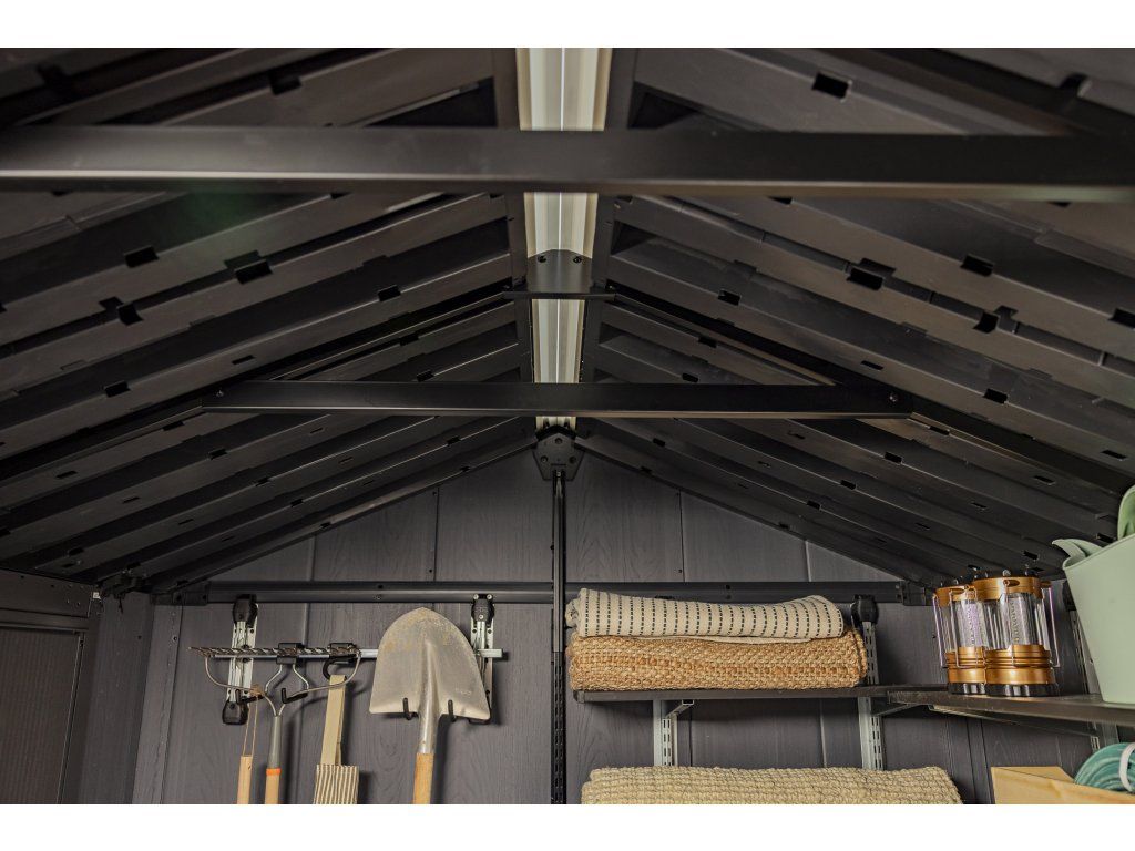 Prémiový materiál DECOCOAT v atraktivní imitaci dřeva kombinuje estetiku přírodního materiálu s minimálními nároky na údržbu. Domek odolává nepříznivému počasí a při správném ukotvení zvládne vítr o rychlosti až 145 km/h. Větrací mřížky podporují cirkulaci vzduchu a světlík po celé délce střechy spolu s dvojicí oken zajišťuje dostatek přirozeného světla. Podlaha s nosností až 150 kg/m2 poskytuje pevnou základnu i pro těžší vybavení. Konstrukce střechy odolá zatížení až 150 kg/m2, takže si poradí i s větší sněhovou nadílkou.