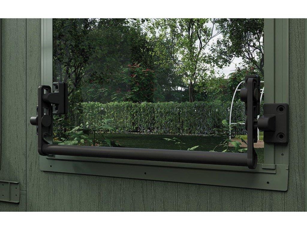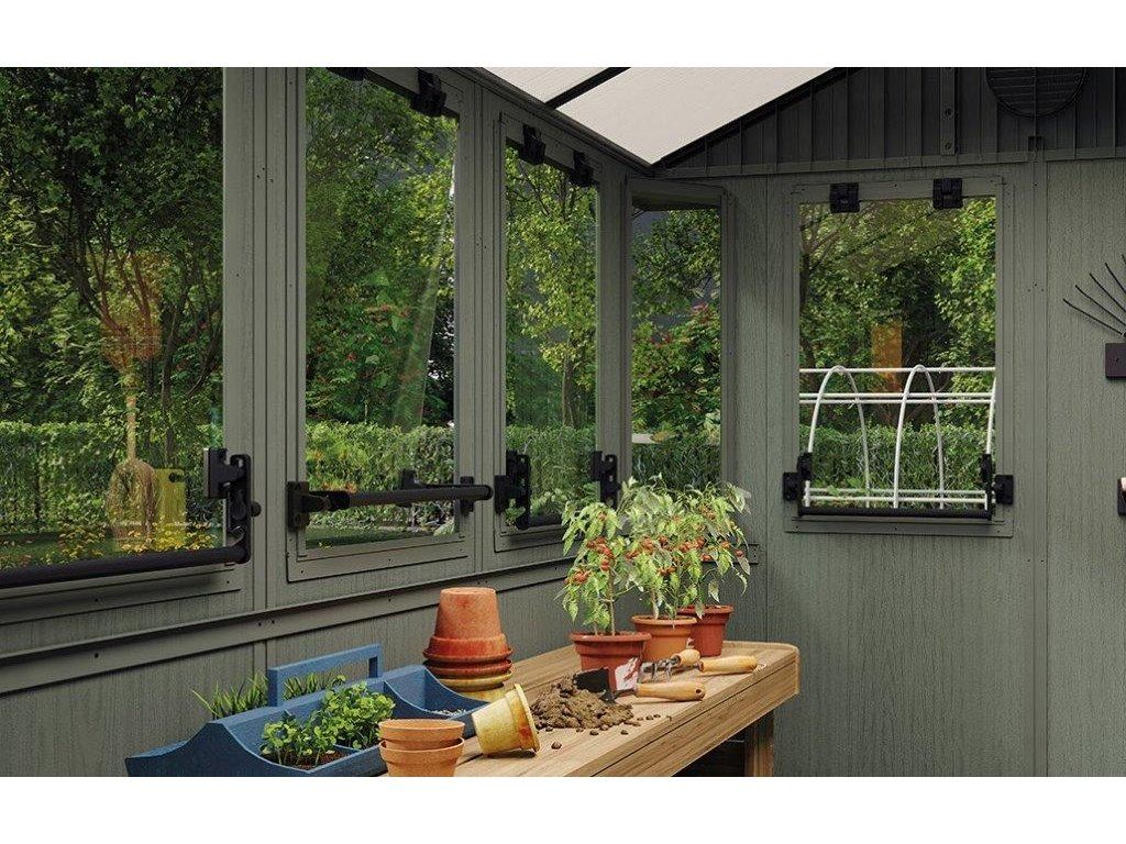 Chcete v domku rozšířit úložný prostor? Namontujte dovnitř 2 police (jsou součástí balení). Uskladníte na ně drobnější pomůcky a předměty. Kromě toho kdykoliv vyvětráte. O cirkulaci vzduchu se postará celkem 5 oken (s možností otevření na 7°).