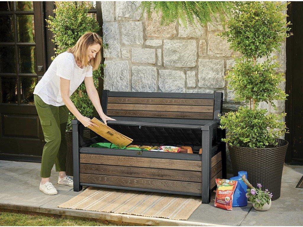 Stylová lavice a praktický úložný prostor v jednom – ideální kombinace pro každou zahradu nebo terasu. Zahradní lavice Keter Deco Garden Bench v dekoru Walnut nabízí pohodlné sezení pro dvě osoby a zároveň slouží jako úložný box o objemu 265 l na polštáře, deky nebo další zahradní doplňky.
