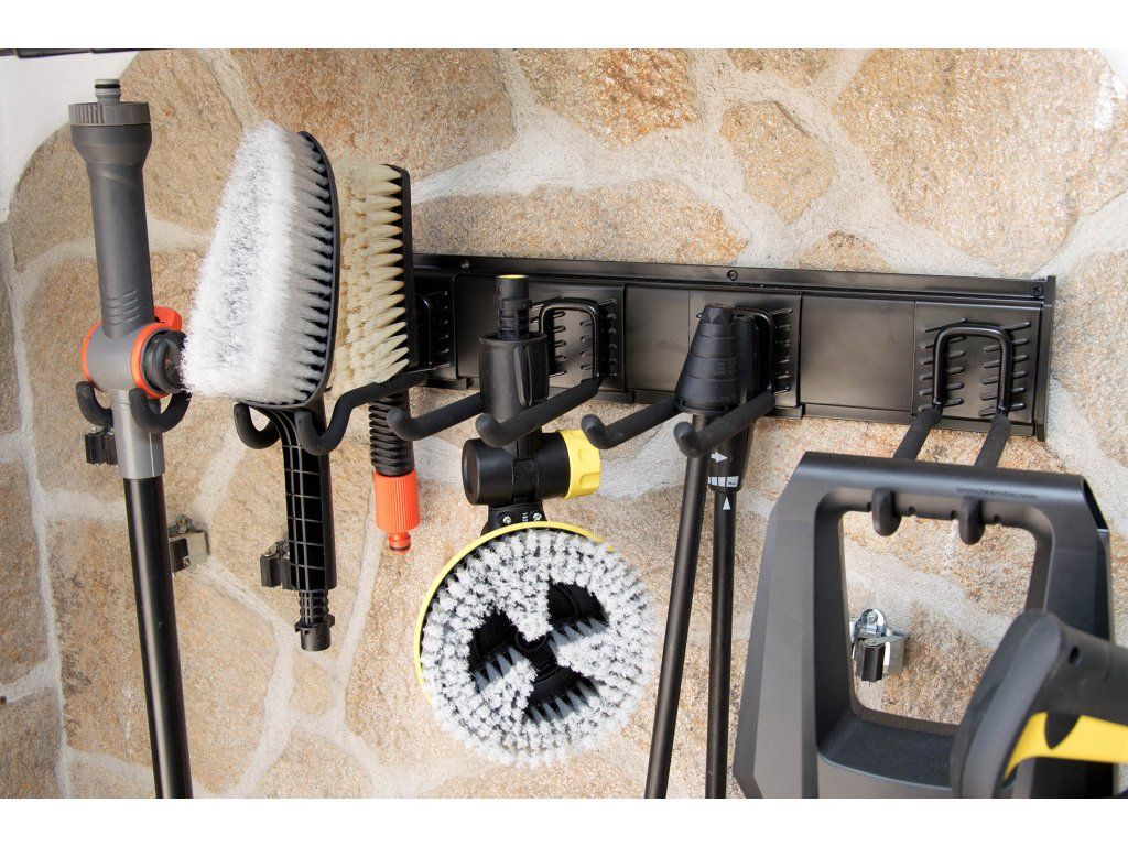 Držák na nářadí je jednoduchý na připevnění a umožní bezpečné zavěšení téměř každého druhu nářadí. Je opatřen gumovým návlekem a zavěšuje se na závěsnou lištu s rozměrem 61 x 10 cm, kterou lze spojovat spojnicí a zakončit plastovou záslepkou.