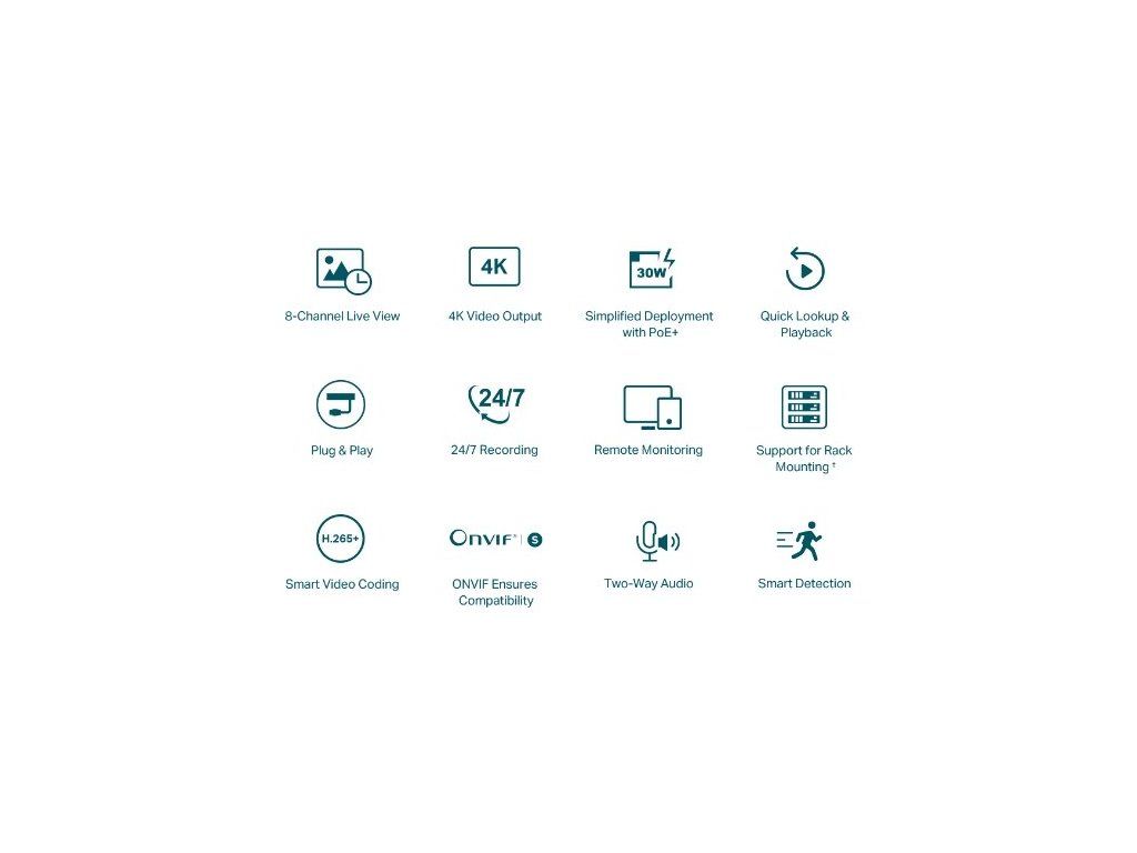 Zařízení TP-Link VIGI NVR1008H-8P s 4K HDMI video výstupem zaznamenává videa z bezpečnostních kamer a usnadňuje jejich správu. Poskytne vám vysoké rozlišení obrazu až 8MP. Ohlídáte si dění na svém pozemku či ve svém podniku (prodejna, sklad, restaurace, penzion). Zobrazíte si záběry až z 8 kamer najednou. Neuteče vám tedy žádný detail. Díky kompresi H.265+ je video křišťálově čisté. Aniž by došlo ke ztrátě kvality, nezabere tolik místa na vašem disku. S jeho pomocí uložíte až 10 TB záznamu z připojených kamer. Aplikace VIGI vám umožní vzdálené monitorování.