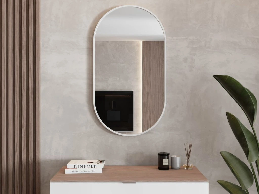 Bílý hliníkový rám působí čistě a jemně. Oválný tvar zrcadlo opticky „zjemní“, takže nepůsobí tvrdě ani v menší koupelně – naopak ji prosvětlí a vizuálně otevře.