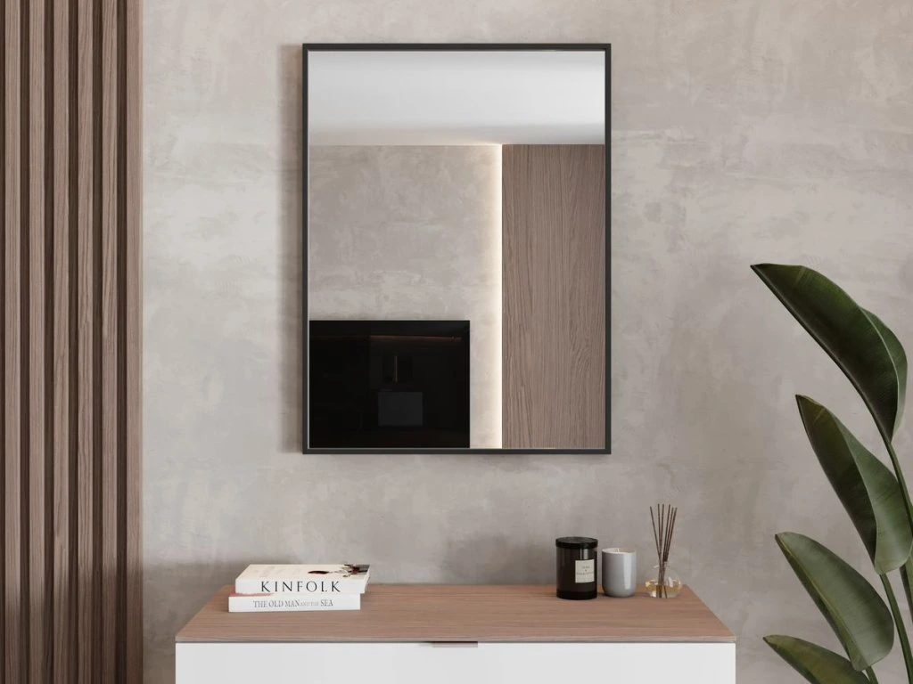 Černý hliníkový rám působí technicky čistě a sebevědomě. Ostré rohy podtrhnou geometrii a zrcadlo hezky sedí k černým bateriím, profilům i industriálním doplňkům.